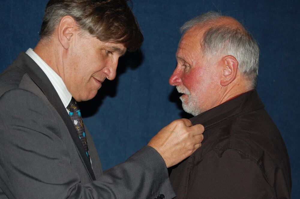 Der Sportkreisvorsitzende Heinz Walter zeichnete Kuno Schmid mit der silbernen Ehrennadel des Württembergischen Landesportbundes aus. FOTO: HÄUSSLER