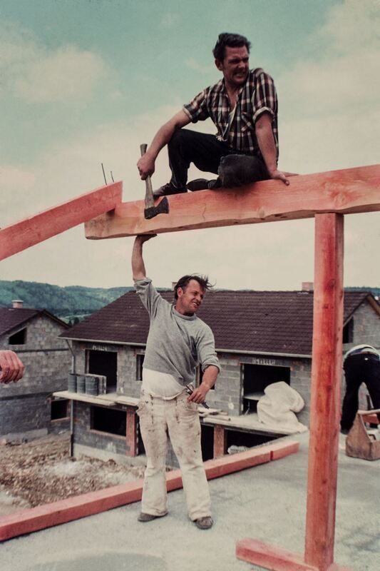 Zimmerleute richten den Dachstuhl einer Doppelhaushälfte auf.