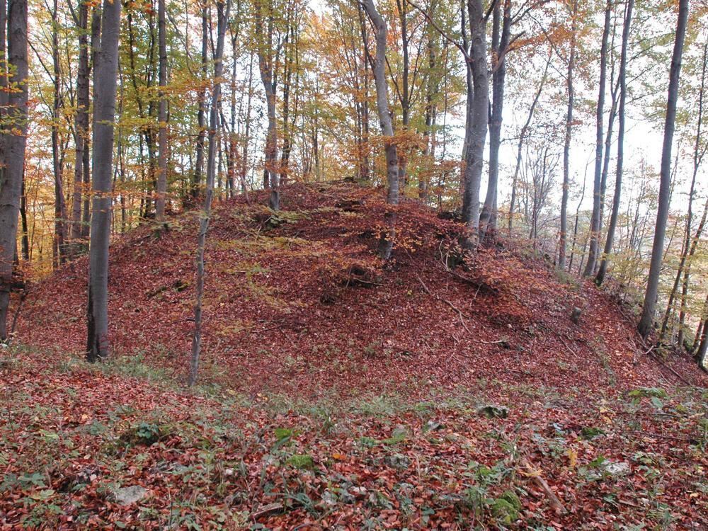 Burghügel und Graben der Burg Hohenlittstein am alten Albaufstieg von Seeburg nach Münsingen. Die Mauern sind verfallen.