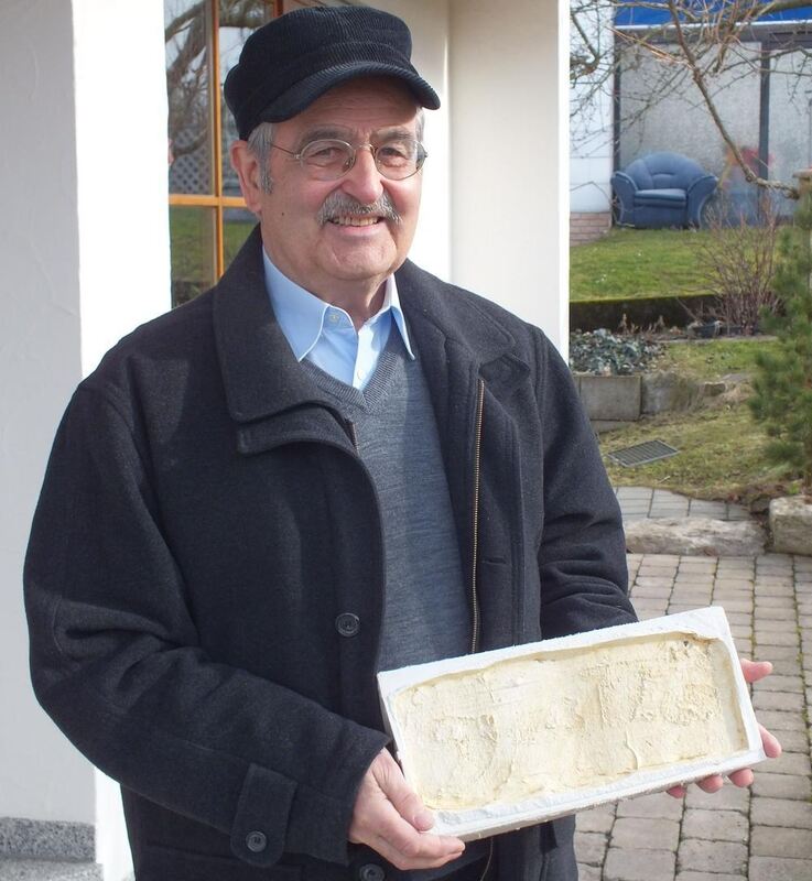 Otmar Gotterbarm mit dem Gipsabdruck einer Fliegerinschrift. »Go to +« wurde in den Baum eingeritzt. Das »+« bedeutet »Schweiz«. FOTO: WURSTER