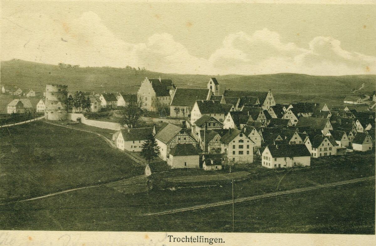 Eine Ansicht von Trochtelfingen aus dem Jahr 1910 zeigt neben Hohem Turm, Schloss, und Kirche auch das imposante Gebäude des Neubaus.