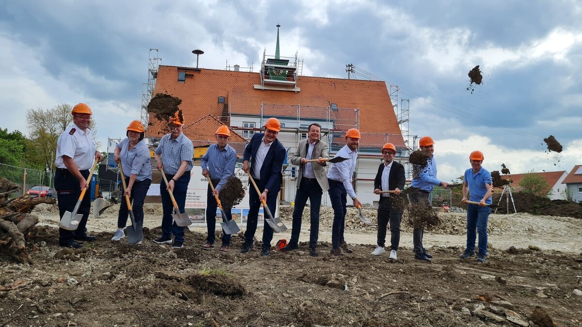 Regierungspräsident Klaus Tappeser und Bürgermeister Florian Bauer (Fünfter und Vierter v.r.) griffen mit Bauleuten, Kommunalpolitikern und dem Pfarrer zum Spaten.