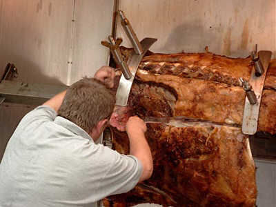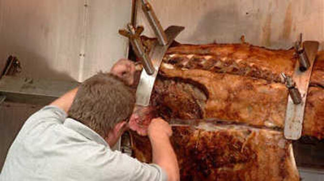 Dieser Braten reicht für viele: Beim Nebelhöhlenfest machten es sich die Besucher im Schatten der Bäume bequem und ließen sich die Pfingstochsen schmecken.