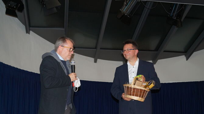 Bürgermeister Mike Münzing (links) mit Michael Blume, dem Antisemitismusbeauftragten der Landesregierung.