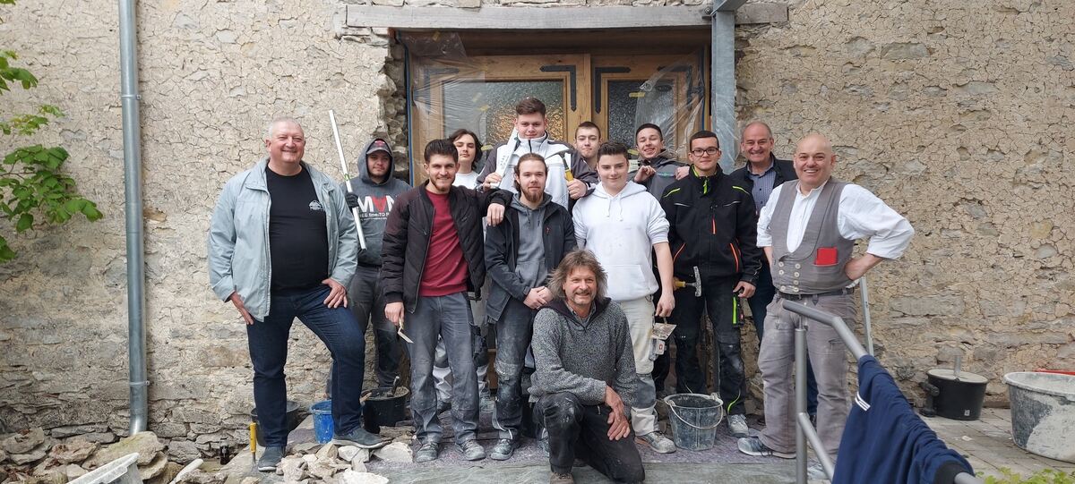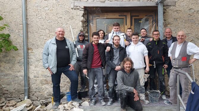 Arbeitseinsatz der besonderen Art: Berufsschüler mauern wie ihre Vorfahren. Mit dabei Marc Bergweiler (links), Uwe Fuchs (Mitte kniend), sowie Bürgermeister Uwe Morgenstern und Berufsschullehrer Jimmy Maas (rechts). FOTOS: FISCHER