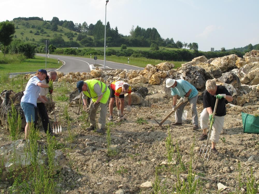 Schon viel geschafft, aber noch lange nicht fertig: Engagierte Münsinger arbeiten im Kreisverkehrsrund an der Dottinger Straße. Jetzt werden noch weitere Mitmachende gesucht. FOTO: PR