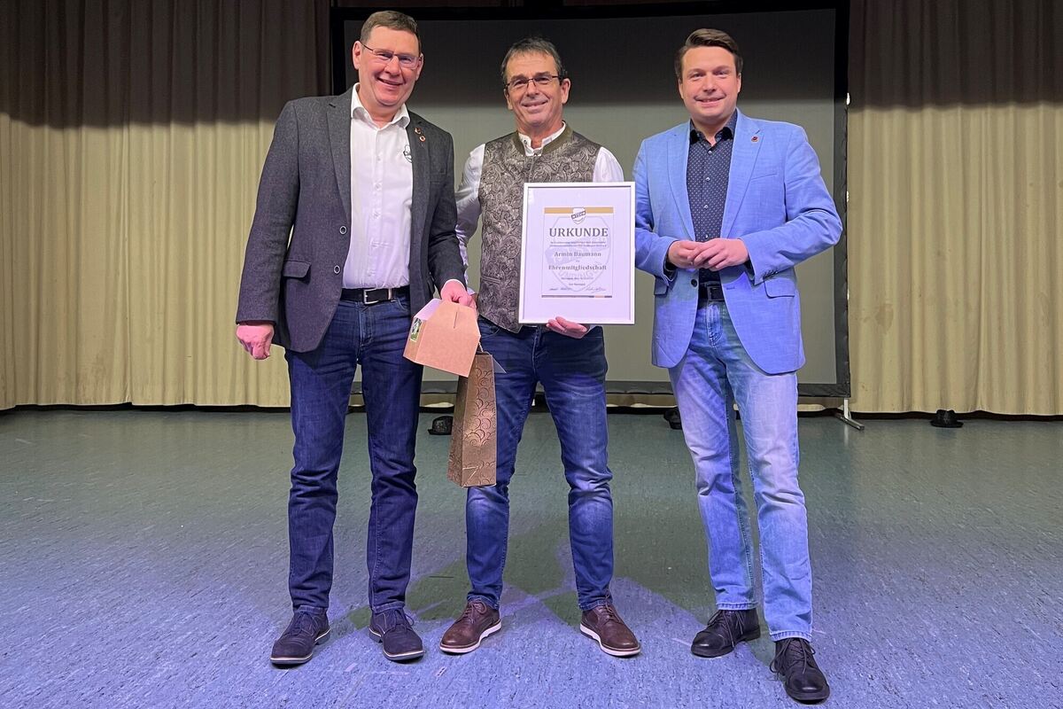 Das neue Ehrenmitglied Armin Baumann (Mitte) mit den Vorständen Manuel Hailfinger (rechts) und Martin Vöhringer.