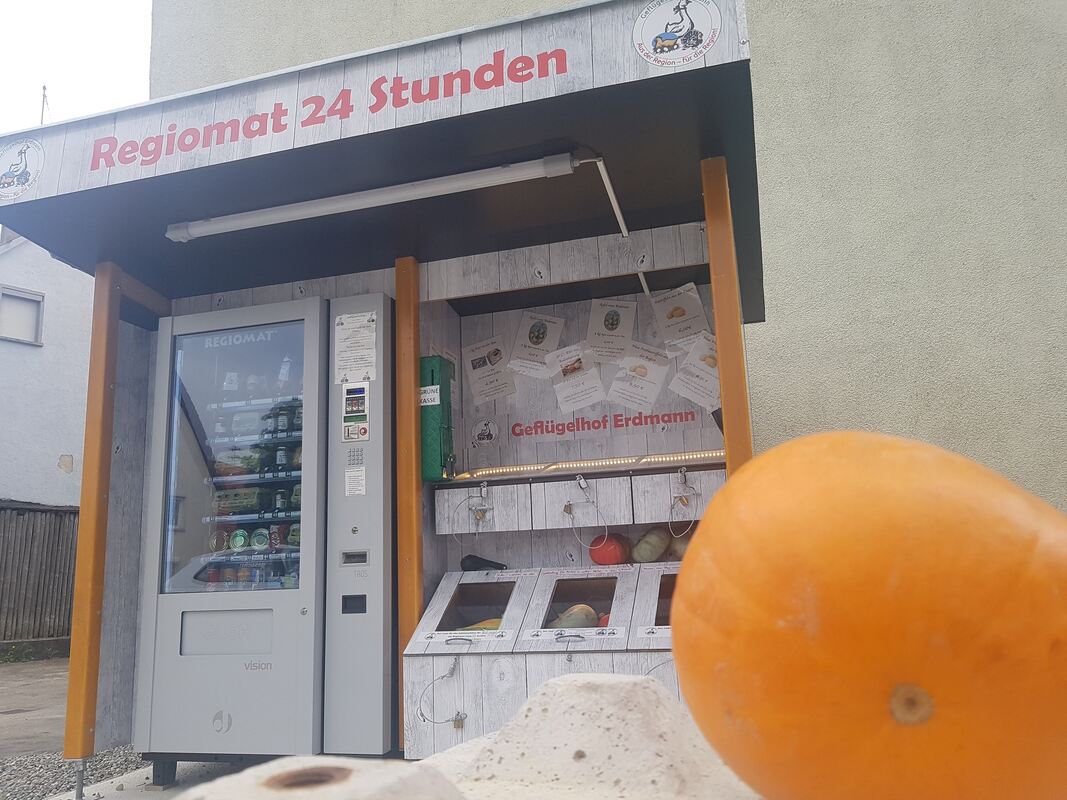 Bei Erdmanns gibt es in Pfronstetten wie auch in Trochtelfingen neben dem Automat noch Kisten mit Kartoffeln, Äpfeln und mehr. Am Automat kauft man einen Code, mit dem man ein Zahlenschloss öffnet.