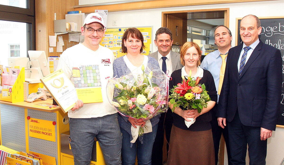 Post und Bäckerei, in Genkingen geht das prima zusammen. Grund zum Feiern für (von links) Michael und Birgit Haug, Hubert Knecht, Bäckerei-Mitarbeiterin Ramona Früh, Tobias Schowalter und Bürgermeister Uwe Morgenstern. FOTO: BAIER