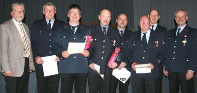Ehrung bei der Feuerwehr in St. Johann (von links): Bürgermeister Eberhard Wolf, Fritz-Otto Röpke, Siegbert Lamparter, Matthias Röcker, Ralf Bauder, Manfred Reusch, Frank Mistele und Kommandant Walter Ochs.