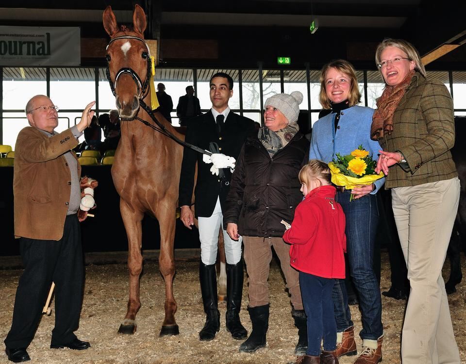 Strahlende Gesichter bei den Käufern und (rechts) bei Gestütsleiterin Astrid von Velsen-Zerweck, die trotz des schlechten Verkaufsergebnisses noch herzlich lächeln kann. FOTO: PULVERMÜLLER