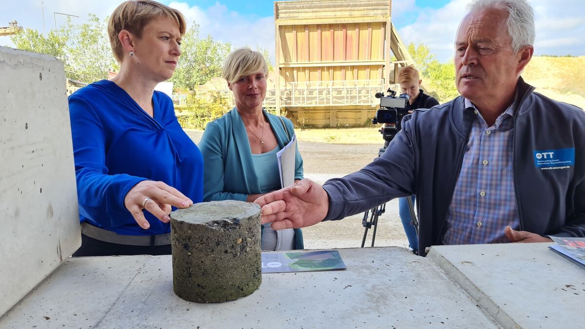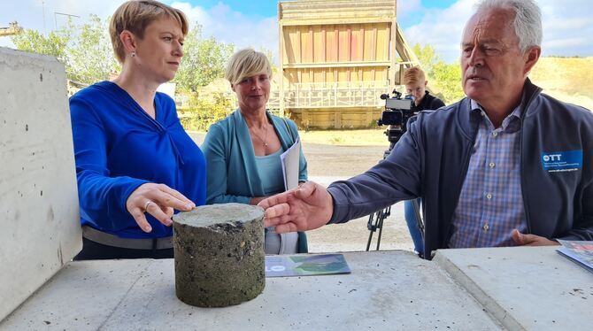 Auch Asphalt kann man aufbereiten und wieder verwenden: Erich Waidmann erklärt Staatssekretärin Andrea Lindlohr (links) und MdL Cindy Holmberg wie’s geht.