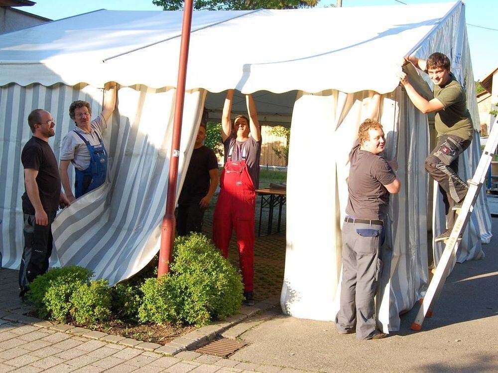 Mitglieder des Jugendclubs Räumle und der Feuerwehroldtimerfreunde bereiten rings um die Mägerkinger Festhalle alles für ihr gemeinsames Fest am Wochenende vor.