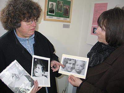 Ingrid Dümmel, Mitarbeiterin des Psychiatriemuseums, zeigt einer Besucherin Bilder der Menschen, deren Schicksale in der Ausstellung »Ausgelöscht. Opfer der NS-Euthanasie aus Tirol, Vorarlberg und Südtirol« dokumentiert werden.
