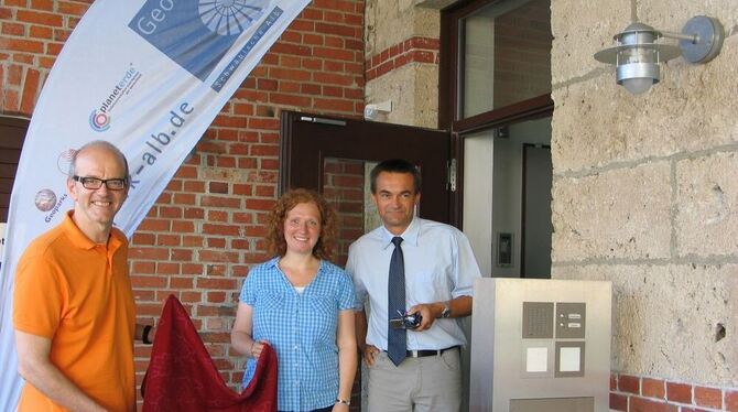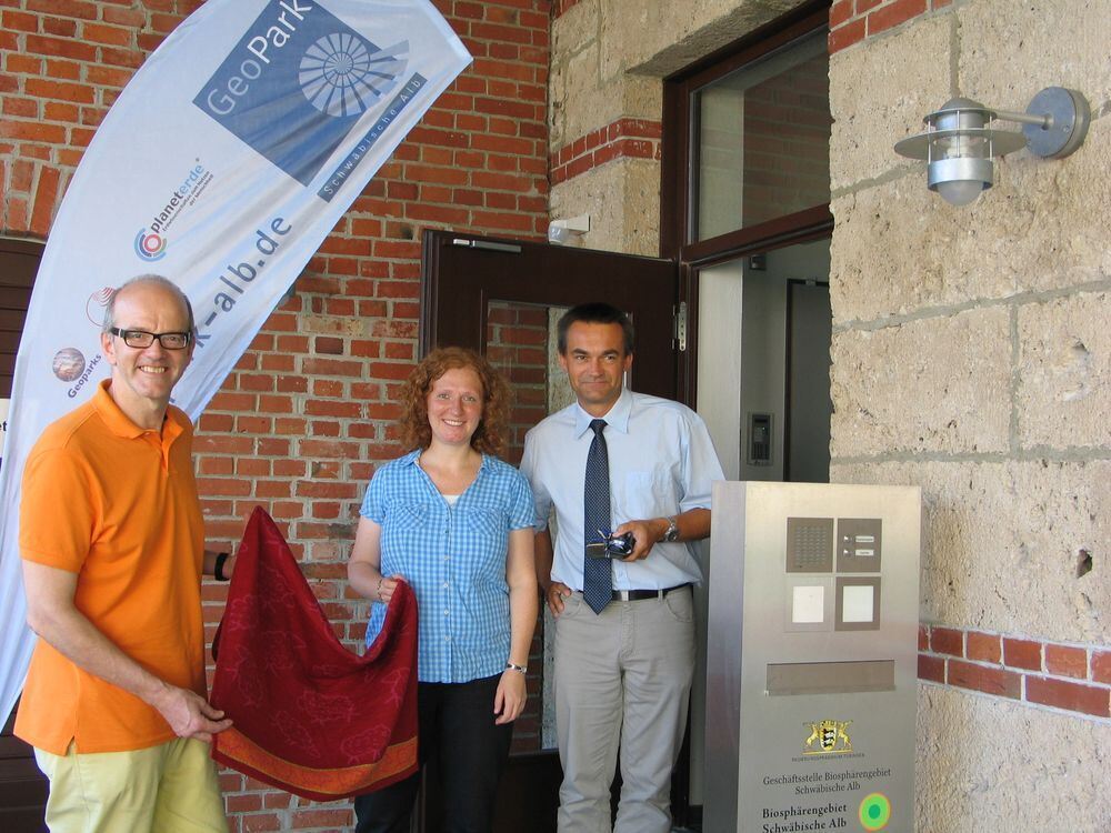 Dr. Siegfried Roth, rechts, ist Nachfolger von Geopark-Geschäftsführerin Renate Schrembs, die in Mutterschutz geht. Ihr schenkte Vorsitzender Hans-Jürgen Stede zum Abschied eine Babydecke mit Schäfchen von der Alb. Foto: Oelkuch