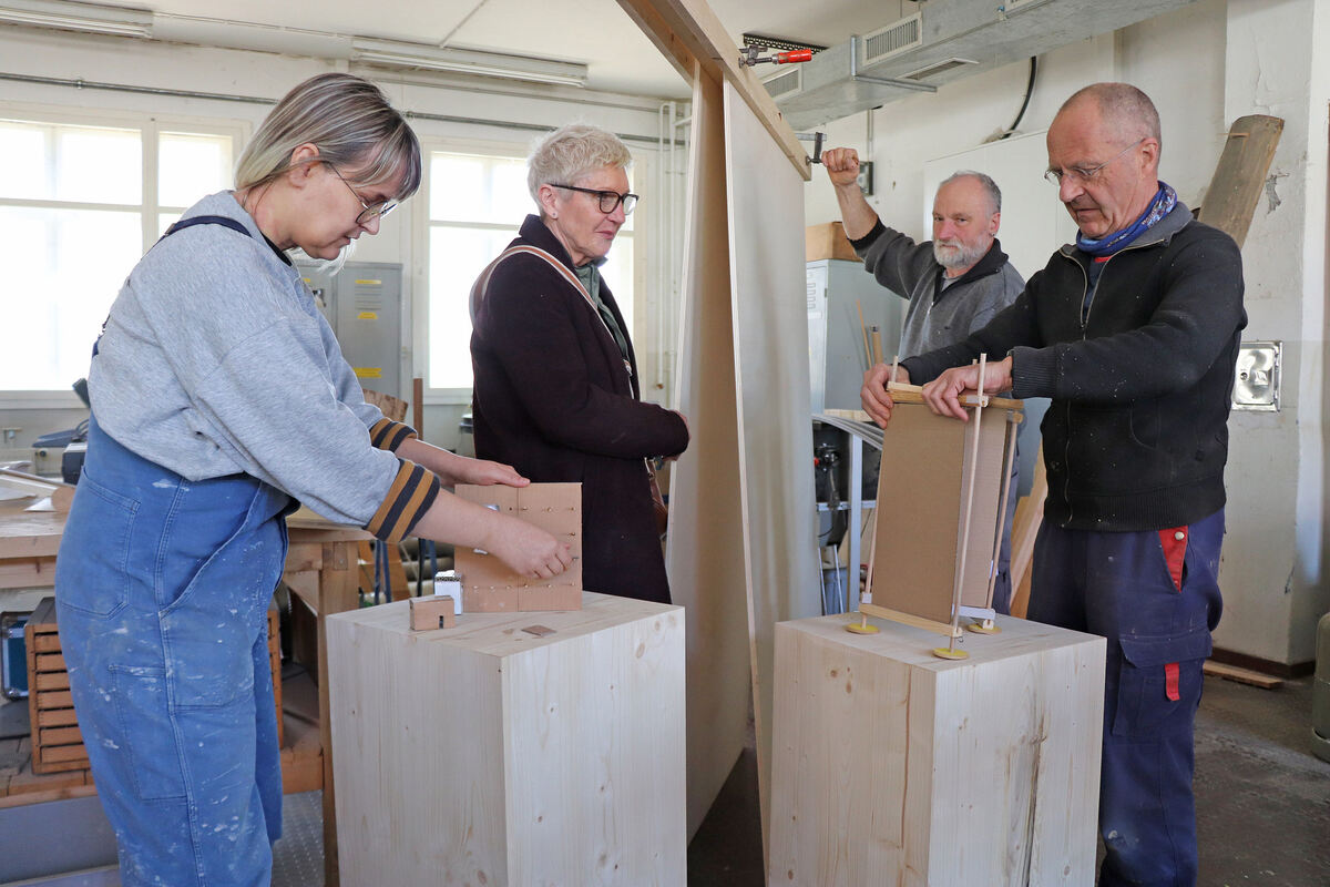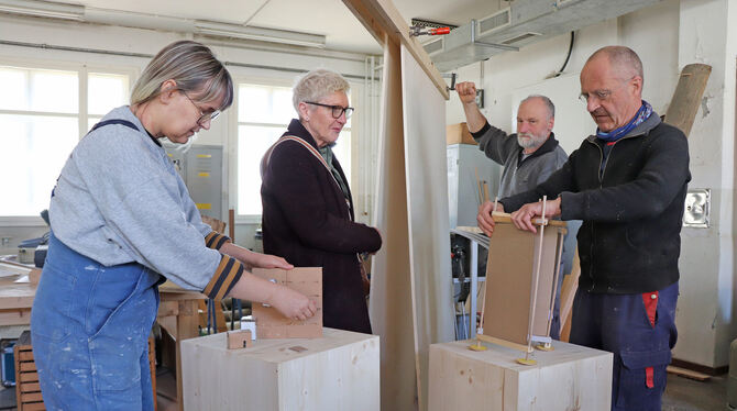 Edith Koschwitz (Zweite von links) zeigt mit der Ausstellung »Onboarding« die Schnittstelle von Kunst und Handwerk. Susanne Hoffmann, Martin Putz und Edgar Braig stellen dafür im Team ein Ausstellungssystem her. FOTOS: BLOCHING