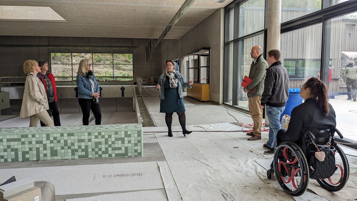 Als vorbildlich bezeichnete Wannweils Bürgermeister Christian Majer das Freibad in Münsingen kurz vor dem Start der Freibadsaison. Auch die anderen Anwesenden waren von den praktischen Umsetzungen zur Barrierefreiheit im Bad begeistert. Dazu gehören, neben einem Lifter ins Schwimmbecken und einer Toilette für alle, beispielsweise auch Spinde auf einer für Rollstuhlfahrer geeigneten Höhe, ein Tastmodell für blinde und sehbeeinträchtigte Menschen und ein Leitsystem, welches durch die reine Nutzung von Symbolen nicht nur Menschen mit kognitiven Einschränkungen, sondern allen Personen mögliche Sprachbarrieren nimmt. Neben dem Freibad wurde das neue Hallenbad besichtigt, das im Herbst eröffnet werden soll.
