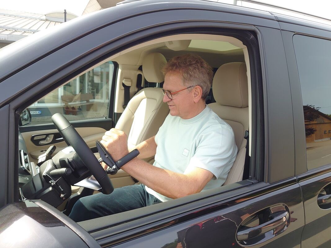 Firmenchef Roland Arnold demonstriert, dass manche seiner Kunden keine Hand frei haben, um den Blinker zu bedienen.