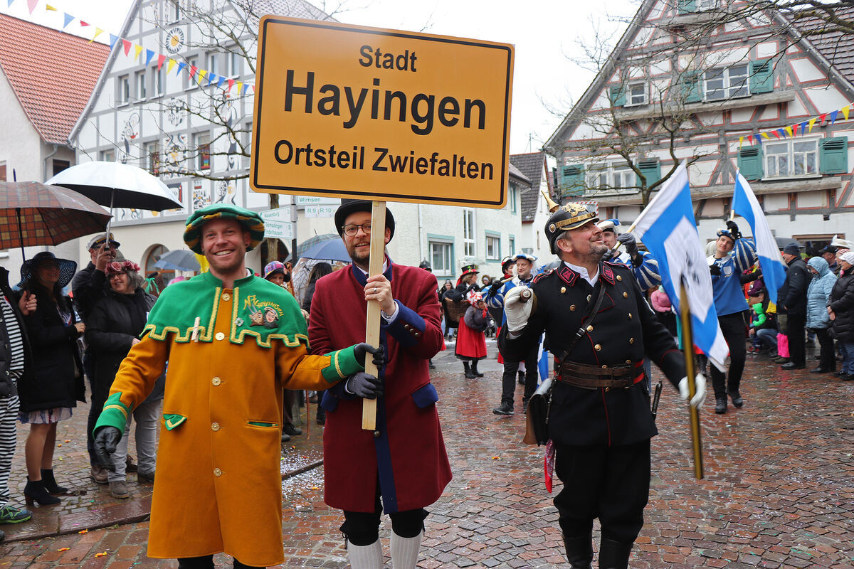 In Hayingen blieben leider viele Umzugsbesucher wohl aufgrund des Regenwetters aus. Dabei konnte die Narrenzunft »Mäck Mäck – Mäck Mäh« in ihrem 50. Jubiläumsjahr einen bunten und unterhaltsamen Umzug mit 38 Zünften, Laufgruppen und Musikkapellen bieten. Darunter auch der CDU-Bundestagsabgeordnete Michael Donth, der hoch oben auf einer beweglichen Ehrentribüne den Umzug gleich nach dem Narrenschäfer samt Narrensamen anführte. Für einen echten Augenschmaus sorgten wie in jedem Jahr die freien Laufgruppen, die in wunderschönen Kostümen als Wahrsagerinnen, Tigerbande, Schotten und Cumulus-Wolken »Donderdoria« die Straßen belebten. Um Zwiefalten nicht bald bürgermeisterlos dastehen zu lassen, hatten sich Zunftrat Daniel Knorr und Hayingens Bürgermeister Kevin Dorner dazu entschlossen, Zwiefalten einzugemeinden. Dies stellten sie demonstrativ im Duo als Ankündigung der Rällezunft mit dem Ortsschild »Stadt Hayingen Ortsteil Zwiefalten« dar.