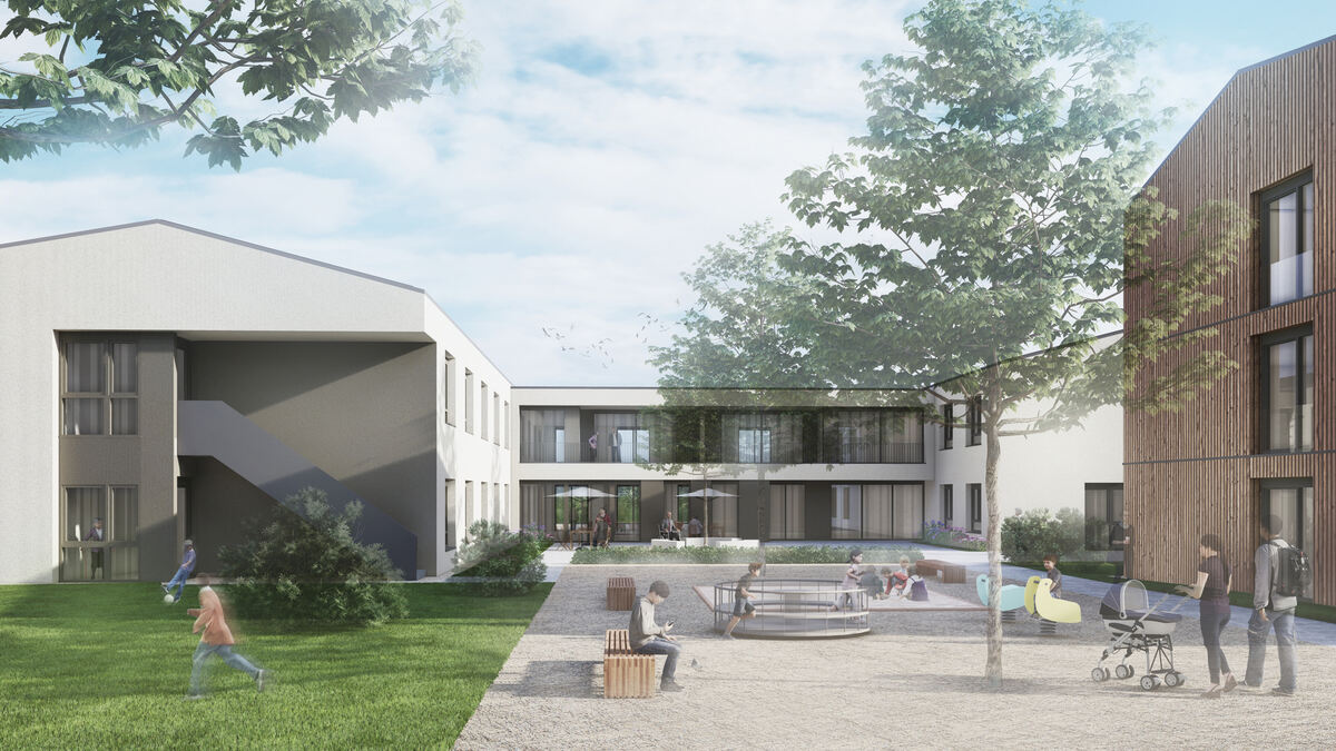 Im neuen Pflegeheim der Samariterstiftung in Willmandingen wird auch eine Begegnungsstätte beziehungsweise ein Bürgertreff entstehen (Mitte). Dort soll auch die Schulkindbetreuung untergebracht werden. VISUALISIERUNG: BAMBERG ARCHITEKTUR