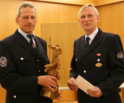Manfred Frommherz (links) erhält von Kommandant August Herb den Heiligen St. Florian für 33 Jahre aktiven Dienst bei der Hayinger Feuerwehr.