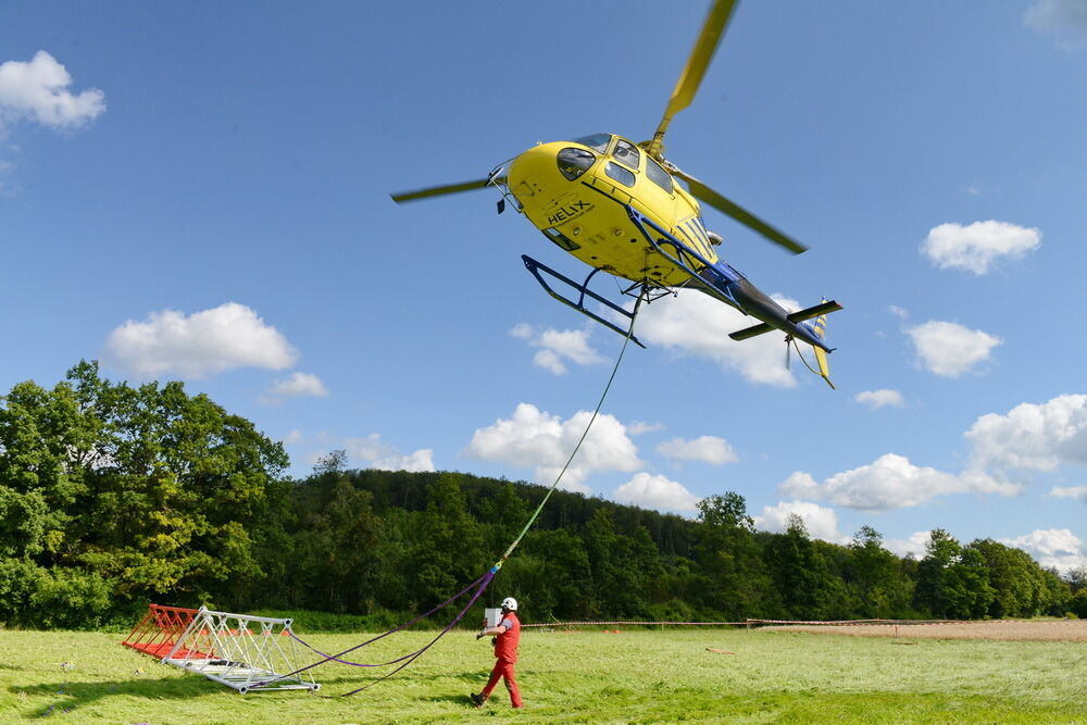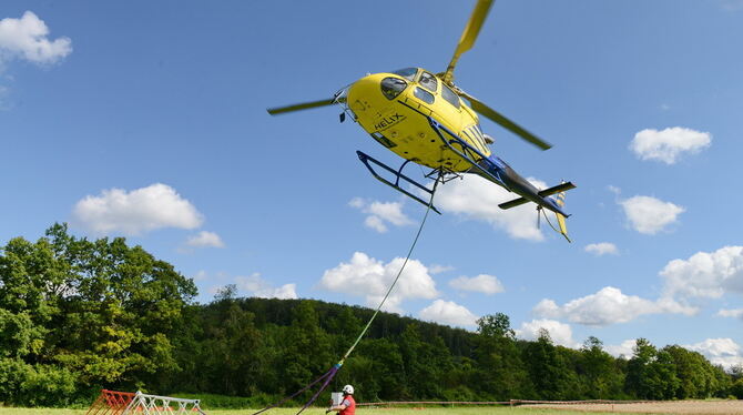 Helikopter und Kletterteam im Einsatz: Wie aus achteinhalb Meter langen Stahlelementen ein Messmast wird, wollten viele Kommunalpolitiker und Journalisten sehen. FOTOS: PACHER