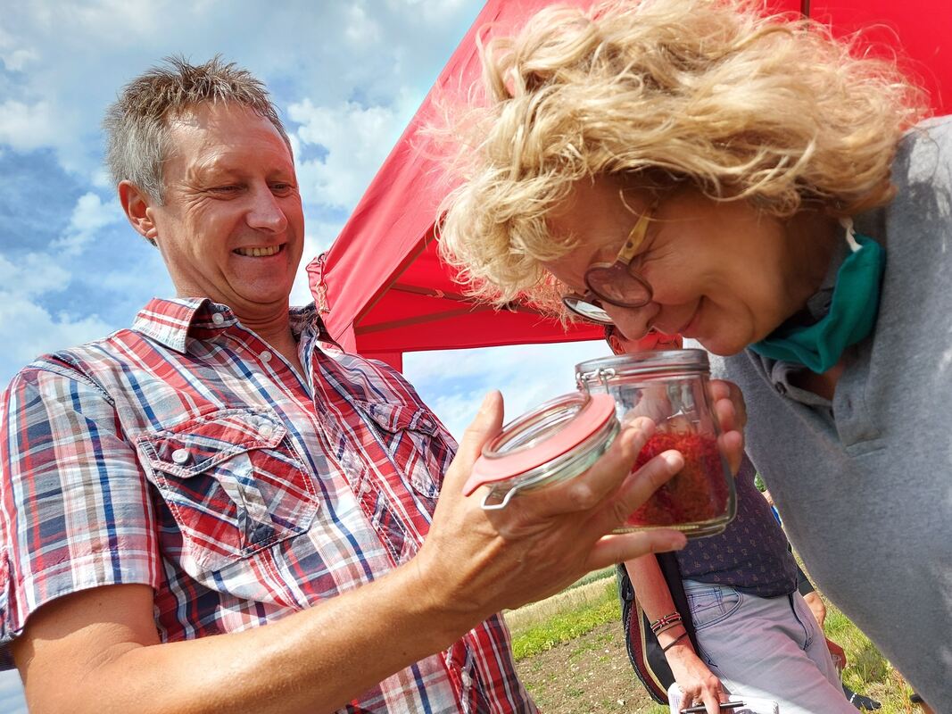 Eine Nase voll Gold: Frank Bahnmüller zeigt Beate Müller-Gemmeke, wie Alb-Safran durftet.