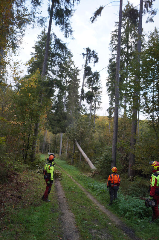 Forstwirt Johann Sigg (links) ist zufrieden, die Fichte fällt wie geplant.