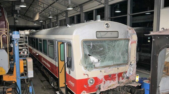 GOMADINGEN-MARBACH/MÜNSINGEN. Der beschädigte Triebwagen, der am Freitagmorgen bei einem schweren Unglück an einem unbeschrankten Bahnübergang in Marbach entgleist ist, steht seit Freitagabend kurz vor 20 Uhr wieder in Lokschuppen im Bahnhof in Münsingen. Die Bergungsarbeiten wurden von einigen Schaulustigen begleitet. Bernd-Matthias Weckler, Geschäftsführer der Schwäbische Alb-Bahn GmbH (SAB), spricht von einem wirtschaftlichen Totalschaden in Höhe von rund 650.000 Euro.