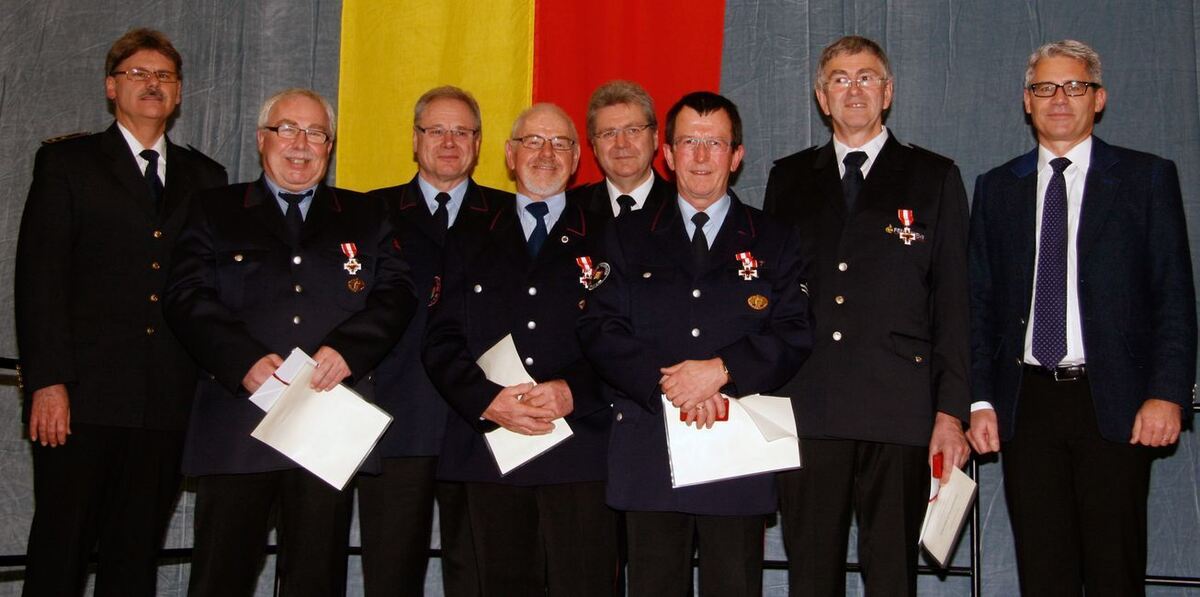 Die Geehrten bei der Hohensteiner Feuerwehr (von links): Kreisbrandmeister Wolfram Auch, Robert Euper, Walter Reyhing, Willi Kober, der Vorsitzende des Kreisfeuerwehrverbands Reutlingen Gunter Hespeler, Albert Schnitzer, Kommandant Gerhard Schuler und Bürgermeister Jochen Zeller. FOTO: LEIPPERT