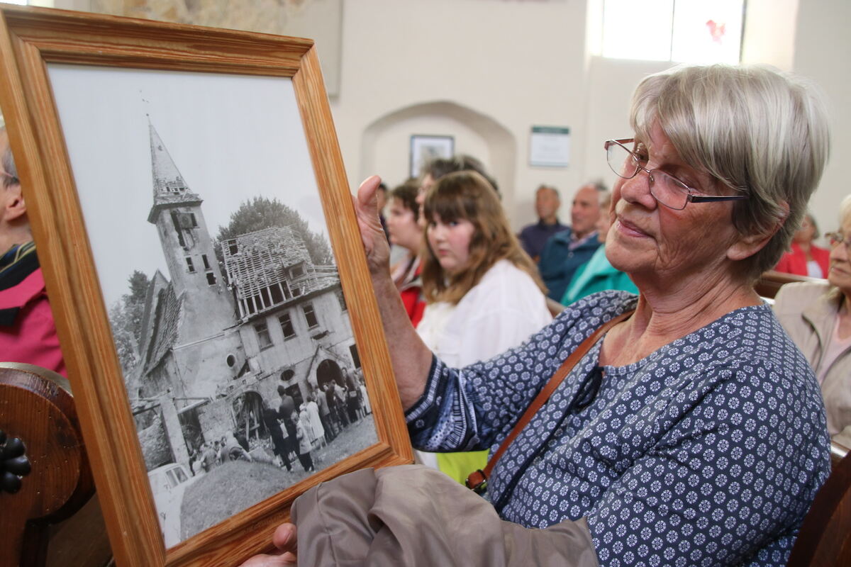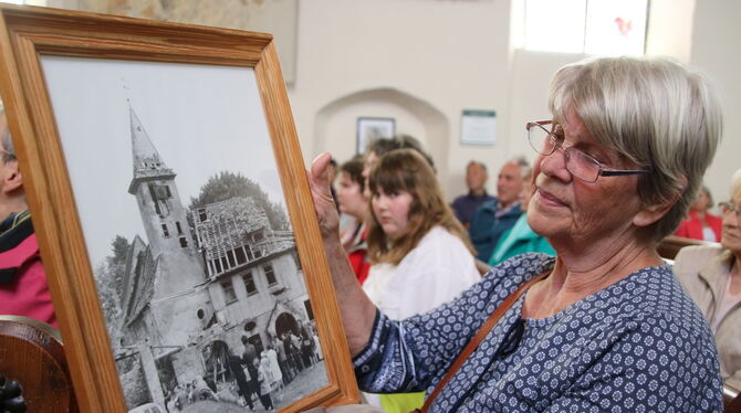 Johanna Endriss aus Wittlingen ist wie viele andere Besucher auch aus Interesse nach Gruorn gekommen, wo sich an Pfingsten ehemalige Bewohner und deren Familien traditionell treffen. Sie betrachtet ein Foto von der Stephanuskirche, das beim Vortrag von Christoph Stephan herumgereicht wird. FOTO: OECHSNER