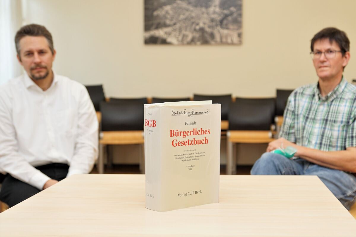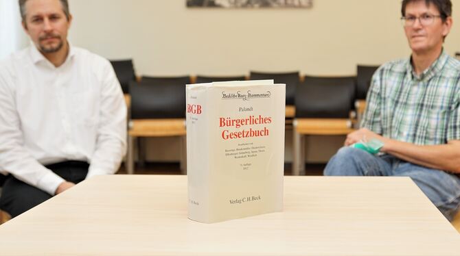 Der Direktor des Amtsgerichts Münsingen, Joachim Stahl (rechts), und sein Richterkollege Matthias Altfelder mit einer Ausgabe des Bürgerlichen Gesetzbuchs, mit dem sie täglich zu tun haben.