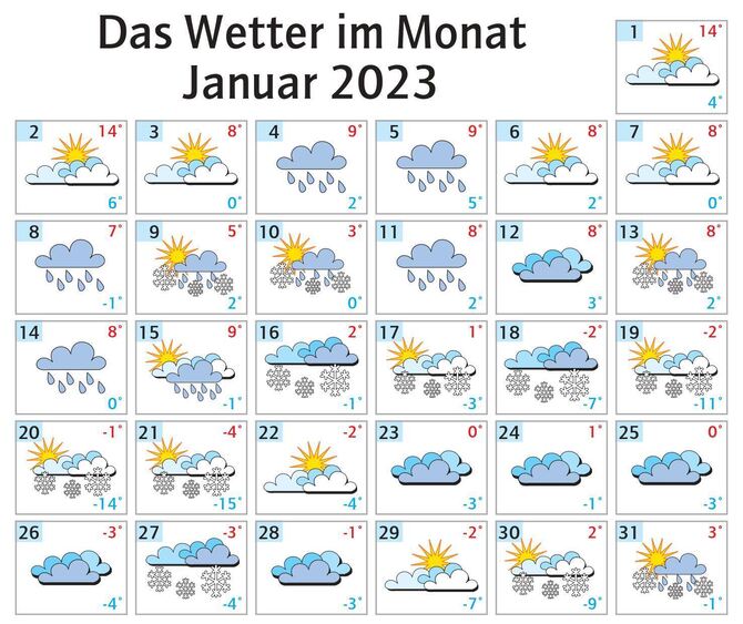 Das Jahr 2023 begann frühlingshaft mit 14 Grad am 1. und 2. Januar. Danach pendelten sich die Tagestemperaturen bei 5 bis 10 Grad Celsius ein, viele Nächte blieben frostfrei. Die Niederschläge fielen zumeist als Regen oder Schneeregen.