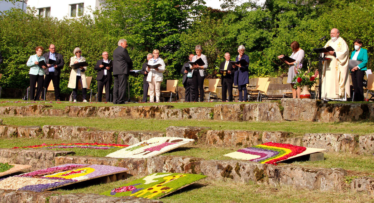 Großengstingens Katholiken feierten Fronleichnam im Schlosshof. Pfarrer Wolfgang Jäger zelebrierte die Eucharistiefeier, der Kirchenchor St. Martin unter Leitung von Günter Polanz umrahmte den Gottesdienst.