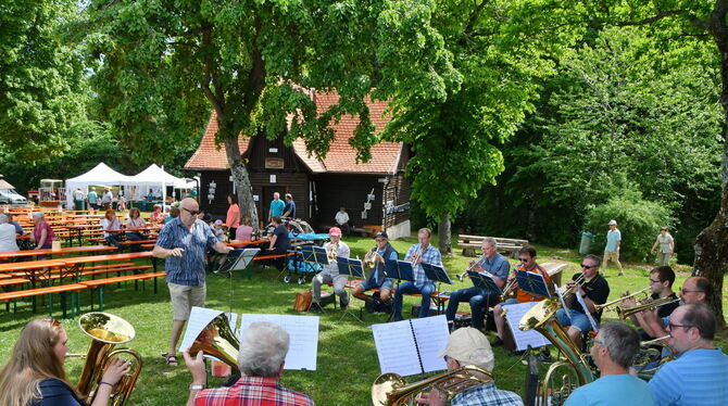 Eigentlich hätte das gemütliche Zusammensein am Albtrauf mit einem Gottesdienst im Grünen beginnen sollen. Aber zugunsten von gleichzeitig stattfindenden Konfirmations- und Tauffeiern wurde in diesem Jahr darauf verzichtet. Unverzichtbar war hingegen der Posaunenchor Willmandingen-Erpfingen, der im Ort den Musikverein ersetzt und unter einer alten schattigen Eiche zum Frühschoppen aufspielte – unbeeindruckt von den über Köpfen der Bläser sich in ihren Nestern tummelnden Raupen des Prozessionsspinners.