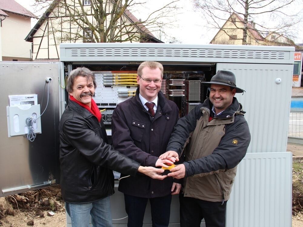 Zusammen mit Projektleiter Johann Speh drücken Engstingens Bürgermeister Mario Storz und Ortsvorsteher Martin Mauser (von links) den roten Knopf, der Kohlstetten ans schnelle Datennetz anschließt.
