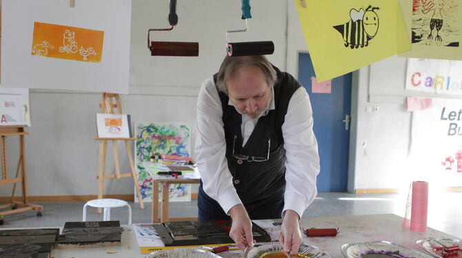 Mit Sonntags-Besuchern fertigt Ralf Rüffle Linoldrucke an. Der kunstvoll gefalzte Liebesbrief war eine Auftragsarbeit für einen Juwelier.