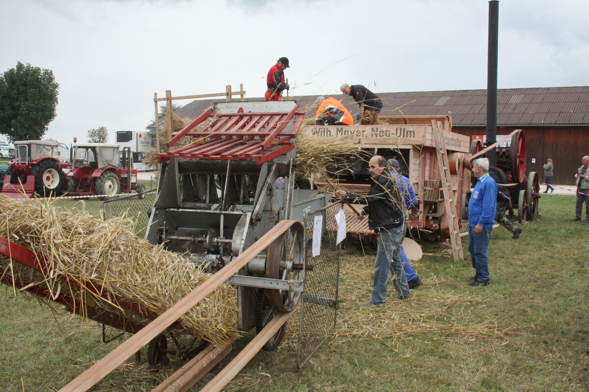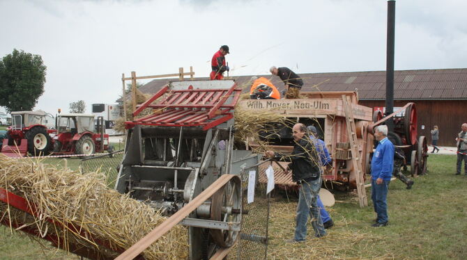 Die Dreschvorführung mit historischen Maschinen stieß beim Bulldog- und Oldtimertreffen in Wilsingen auf großes Interesse. foto: köper