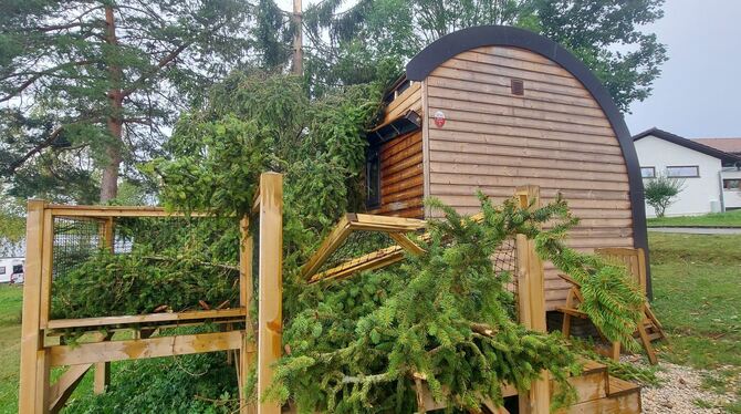 Ein Baum ist am Azur-Campingplatz in Sonnenbühl-Erpfingen auf die Terrasse einer Woodlodge gekracht.