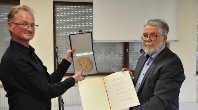 Zelter-Plakette für den Gesangverein Frohsinn Upfingen: Vereinsvorsitzender Joachim Held (links) und der Vorsitzende des Chorverbandes Ludwig Uhland Eberhard Wolf. FOTO: BIMEK