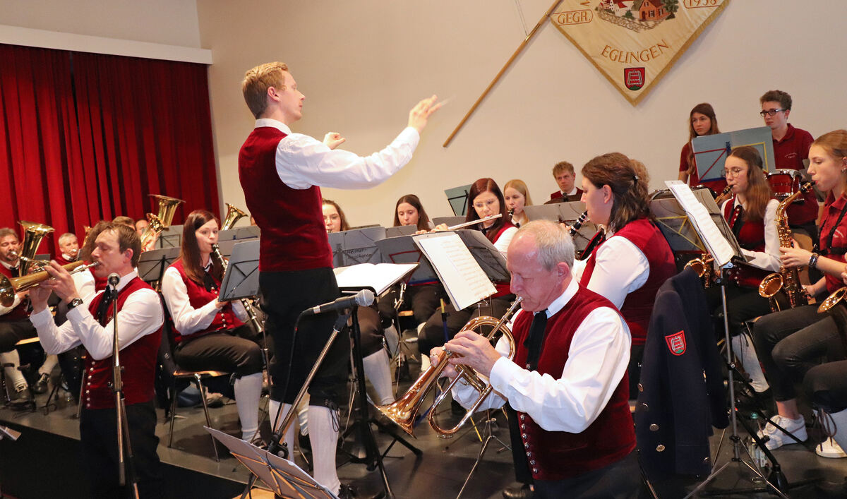Stephan Bross (links) gab kurzzeitig den Taktstock an Jan Schlageter ab, um gemeinsam mit Josef Hölz (rechts) »Das Goldene Flügelhorn« zu spielen. FOTO: BLOCHING