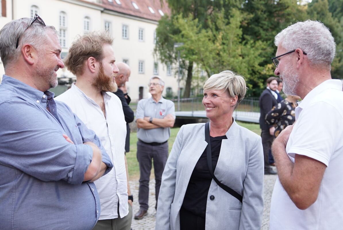 Die grüne Landtagsabgeordnete Cindy Holmberg machte zum Ende ihrer Sommertour in Zwiefalten Station und unterhielt sich mit den Bürgerinnen und Bürgern, die anlässlich der militärischen Zeremonie vor dem Münster gekommen waren. FOTO: LENK