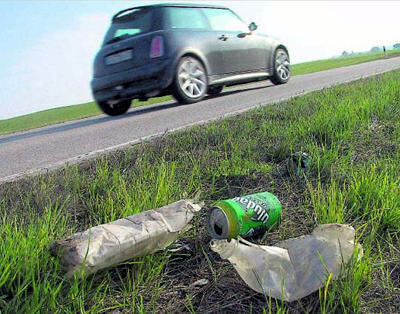 Müllplatz Straße. In Ex-und-Hopp-Manier entsorgt die Wegwerfgesellschaft Abfall übers Autofenster.
