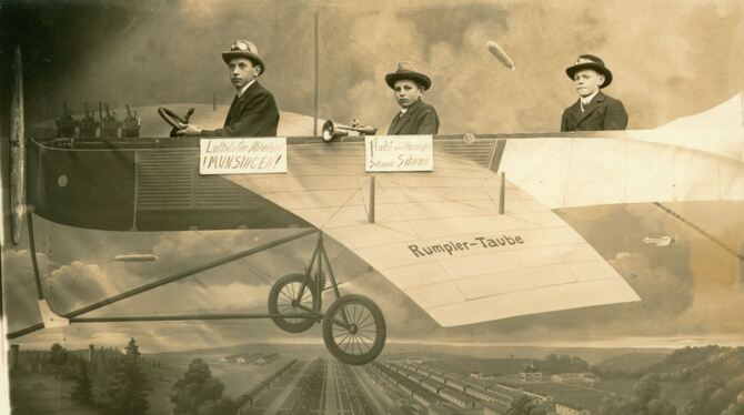 Ob eine Fotografin oder doch ein Fotograf hinter dem April-Motiv des historischen Bildkalenders für 2021 steckt, ist leider nicht bekannt. Fest steht: Die Studioaufnahme, die im oder um das Jahr 1917 entstanden sein muss, ist nicht nur kurios, sondern typisch für die Zeit. Deshalb hat sie es auch in die Endauswahl für den Kalender mit historischen Motiven aus dem Fundus des Münsinger Archivs geschafft, die Hans-Peter Engelhart gemeinsam mit Stadtarchivar Yannik Krebs getroffen hat. Über der gemalten Kulisse des Alten Lagers schweben drei junge Herren im Sonntagsstaat in der »Rumplertaube« – so steht’s auf dem Flügel des Luftschiffs – von dannen. Was sie zum Abheben veranlasst? Die »Flucht aus Münsingen/schwäbisch Sibirien« ist’s, so ist es auf einem Schild zu lesen. Humor, so viel steht fest, hatten sowohl der Fotograf als auch seine Modelle. Darüber schmunzeln kann man auch heute noch.