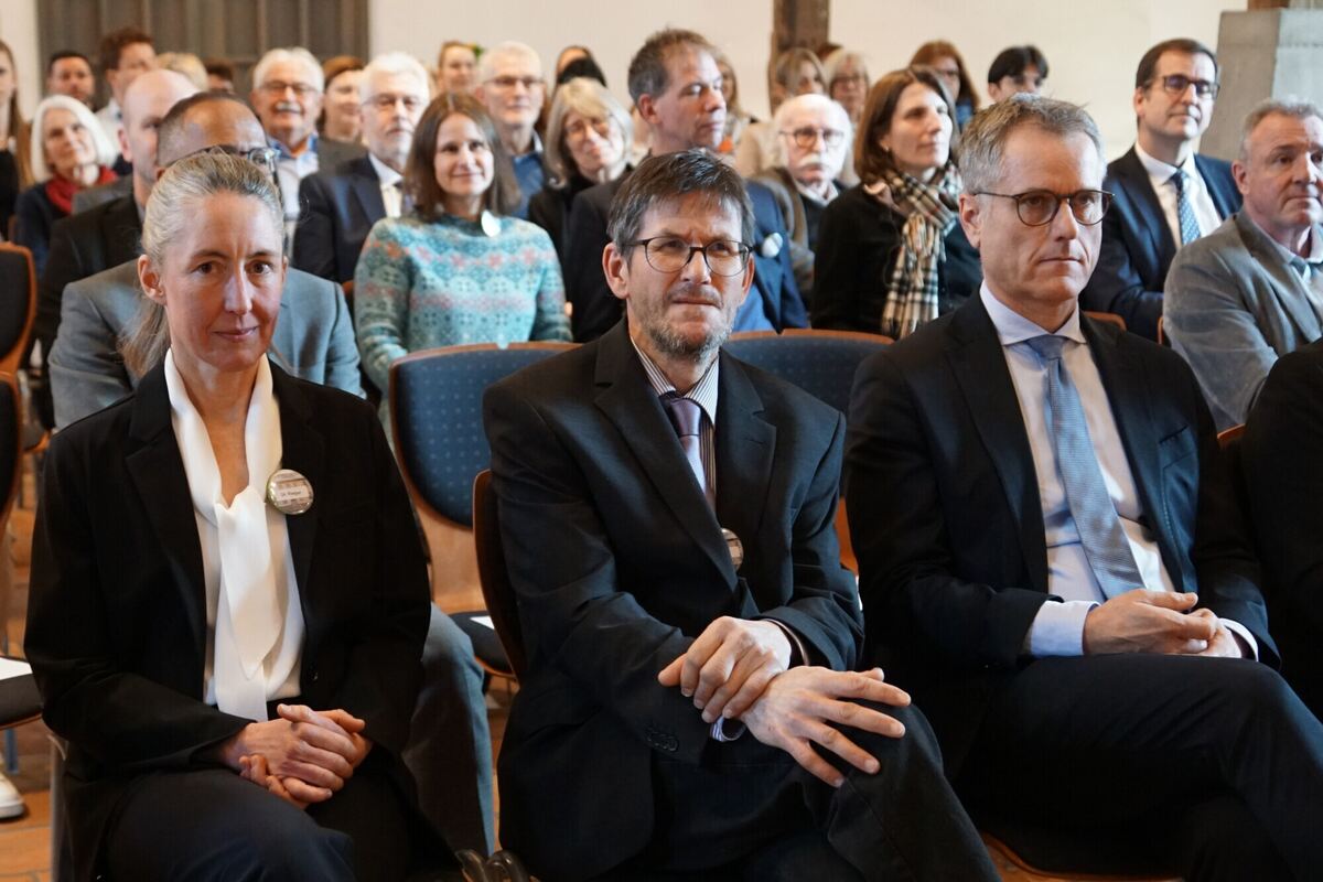 Andreas Holzwarth, Präsident des Landgerichts Tübingen (von rechts), mit dem ehemaligen Direktor des Amtsgerichts Münsingen Joachim Stahl und seiner Nachfolgerin Katja Rieger bei der Feier in der Zehntscheuer.
