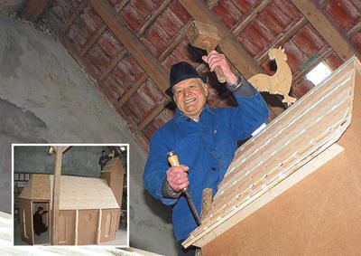 Der Wasserstetter Zimmermann Karl Starzmann hat die Dapfener Martinskirche im Maßstab 1:6,5 nachgebaut. Das Schmuckstück wird einen der vielen Wagen zieren, die beim historischen Festzug am 27. Juni durch den Flecken rollen. Gomadingens Bürgermeister Klemens Betz hat das Modell auch schon von innen bestaunt (kleines Bild).