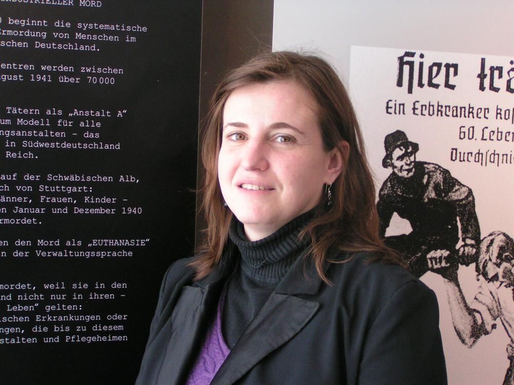 Franka Rößner in der Ausstellung im Dokumentationszentrum, die die Geschichte der Euthanasie-Verbrechen zeigt.