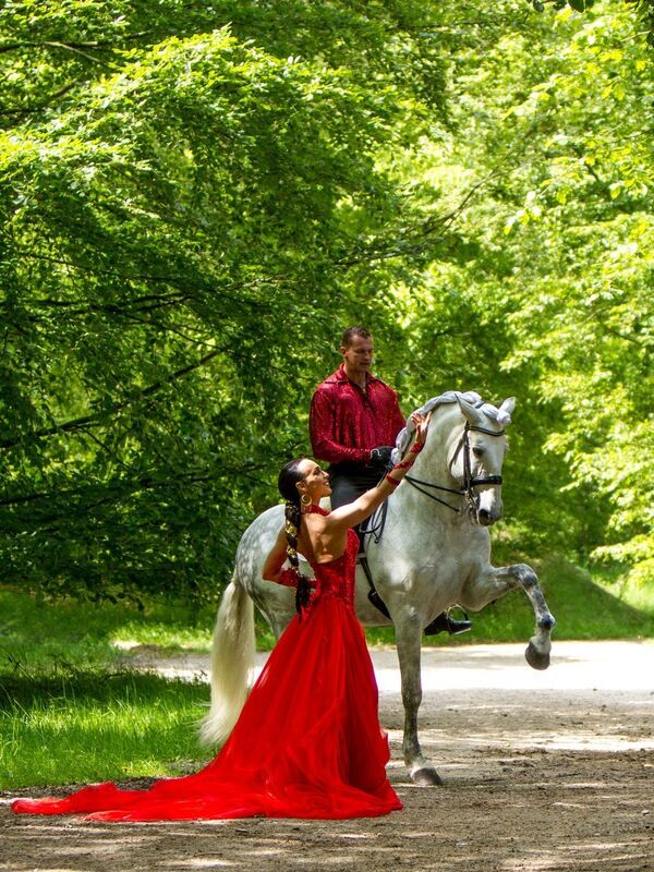 Außergewöhnlicher Pas de trois. Ana Ayromlou und Oliver Jubin setzen mit ihrer Tanz- und Reitkunst den Lusitanohengst Rufia in Szene. FOTO: CATHRIN SCHÜTT
