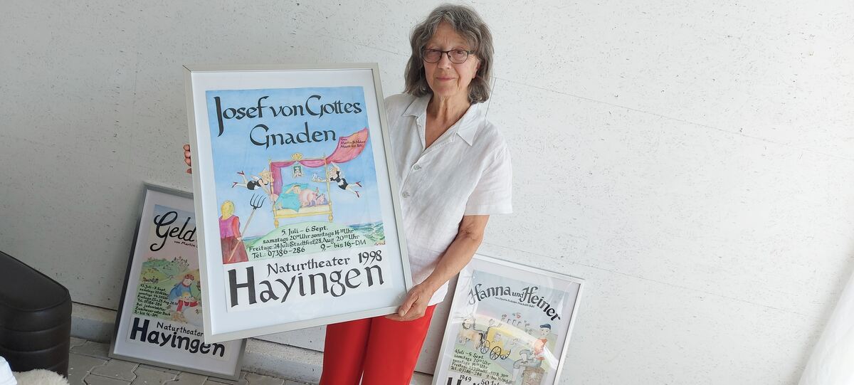 Christa Schleker hat über Jahrzehnte die Plakate für die Aufführungen im Naturtheater Hayingen gestaltet. Als Hommage an ihren im vergangenen Jahr gestorbenen Mann Martin Schleker zeigt sie die Werbeplakate in der Galerie Sphäre in Ehestetten. FOTOS: FISCHER