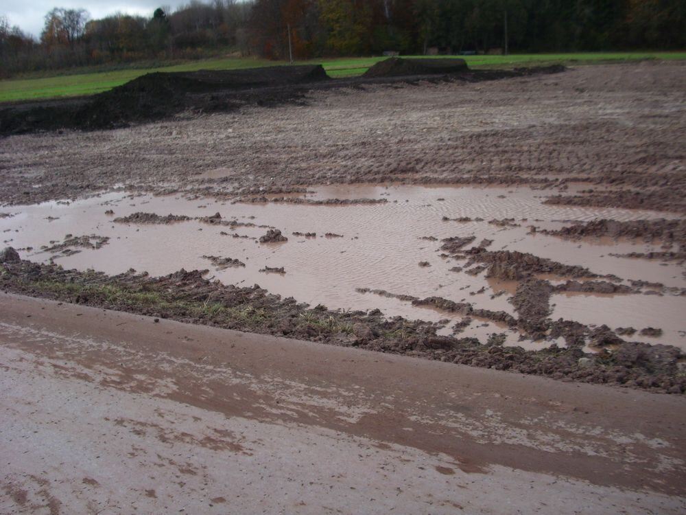 Wo früher eine Senke war, ist das Gelände zwar eben, aber oft mit einem »See« bedeckt: Auf Genkinger Markung nahe der Nebelhöhle ist rote, lehmige Erde (hier ein Bild, das während der Bauarbeiten aufgenommen wurde) eingebaut worden. FOTO: PR